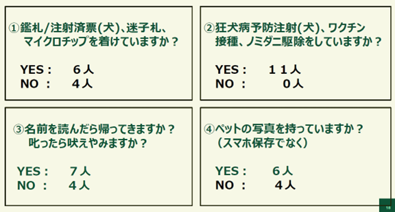 避難準備アンケートでは、鑑札・迷子札・マイクロチップ装着、ワクチン接種状況、ペット写真の携行など、基礎的な備えにばらつきが見られ、今後の啓発の必要性が明確になりました。