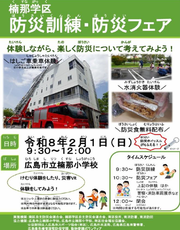 2026年2月1日(日)、広島市立楠那小学校において「広島市南区楠那学区 防災訓練・防災フェア」が開催されました。